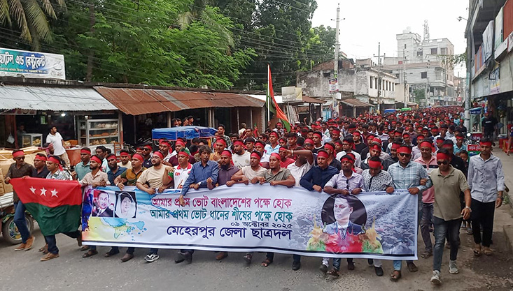 আমার প্রথম ভোট বাংলাদেশের পক্ষে হোক, আমার প্রথম ভোট ধানের শীষের পক্ষে হোক" এই স্লোগানকে সামনে রেখে সমবেশ ও মিছিল করেছে মেহেরপুর জেলা ছাত্রদল। বৃহস্পতিবার (৯ অক্টোবর) বিকালে মেহেরপুর সড়ক বিভাগের সামনে থেকে একটি মিছিল বের হয়ে শহরের প্রধান প্রধান সড়ক প্রদক্ষিণ করে কাথুলি বাসস্ট্যান্ডে গিয়ে শেষ হয়।