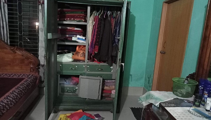 জানা গেছে, মরহুম নজরুল ইসলামের স্ত্রী শুক্রবার সকালে মারকাজ মসজিদ পাড়াস্থ বাড়িতে তালা দিয়ে তার পিতার বাড়ী সদর উপজেলার গোপালপুর গ্রামে বেড়াতে যান। এ সময় বাড়িতে কেউ না থাকার সুযোগ নিয়ে সঙ্গবদ্ধ চোরের দল তালা ভেঙে ঘরে প্রবেশ করে আলমারিতে রাখা নগদ ৬০ হাজার টাকা ও ৪ ভরি স্বর্ণের অলংকার নিয়ে চলে যাই।