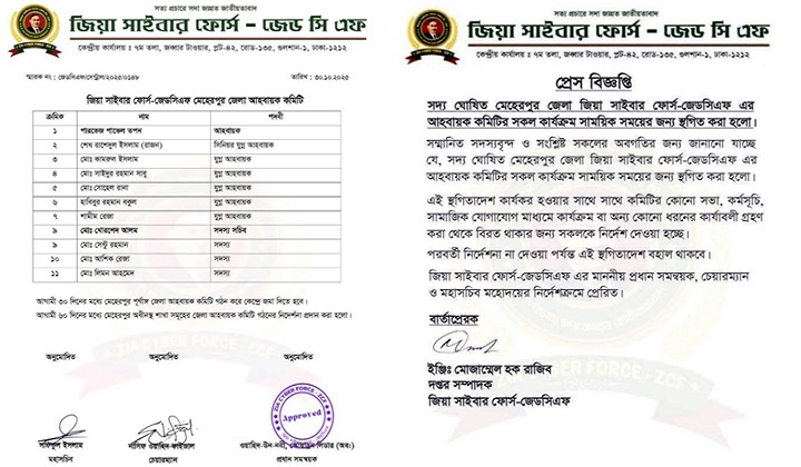 মেহেরপুর জেলা জিয়া সাইবার ফোর্স কমিটি ঘোষণার ৫ ঘন্টার মাথায় স্থগিত