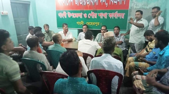 বর্তমান সরকারের পদত্যাগ ও নির্দলীয় নিরপেক্ষ সরকার ব্যবস্থা ফিরিয়ে আনার আন্দোলন বেগবান করা এবং সংগঠনিক শক্তি বৃদ্ধির লক্ষ্যে গাংনী পৌরসভার ১নং ওয়ার্ড বিএনপি নেতাকর্মীদের নিয়ে মতবিনিময় সভা অনুষ্ঠিত হয়েছে। শুক্রবার